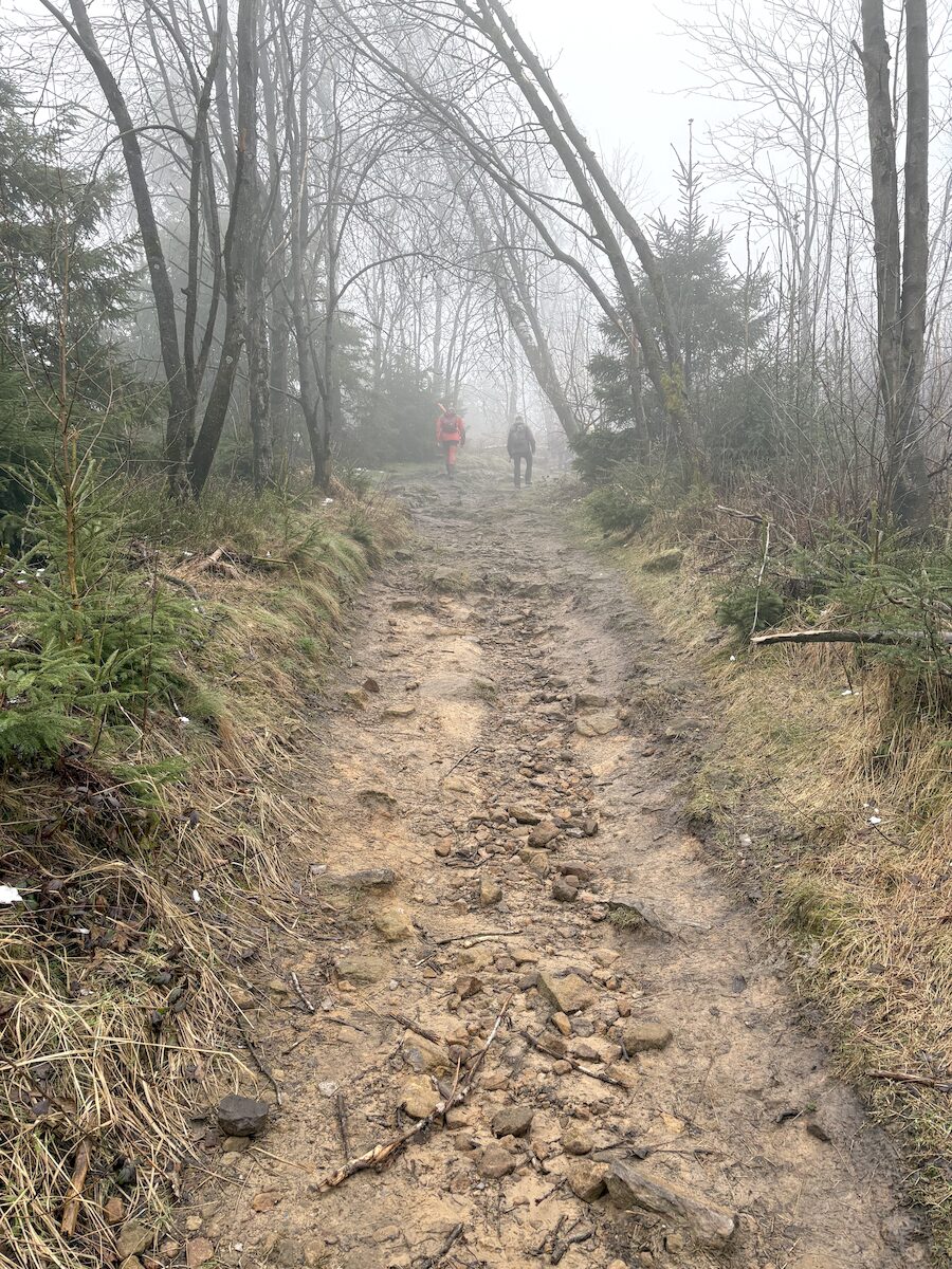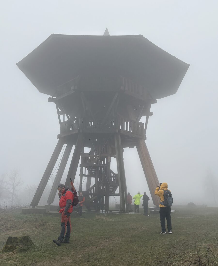Von dort führte der viel begangene Weg zur nebelverhangenen Preußischen Velmerstot (468 m) mit dem Eggeturm, der höchsten Erhebung im Lipperland.